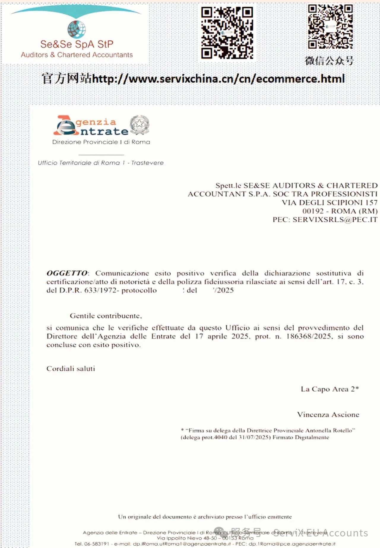 深圳,2025年8月11日——在意大利税局出台严苛保证金新政的第120天,意大利注册会计师Francesco率领SE&SE Auditors & Chartered Accountant S.p.A. Società tra Professionisti(SE&SE审计师与注册会计师股份有限公司)所完成历史性突破:正式获得意大利税务局(Agenzia delle Entrate)官方资质认证,成为中国境内首家且目前唯一具备新规下完整资格的税务代表机构。即日起,中国卖家可通过Francesco先生在深圳设立的分支公司Servix 提交意大利VAT注册业务。