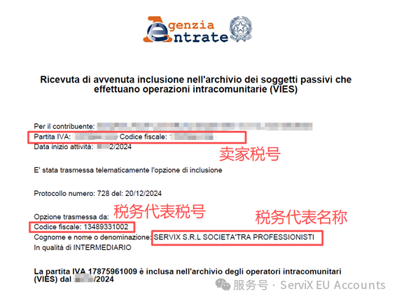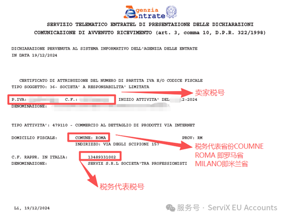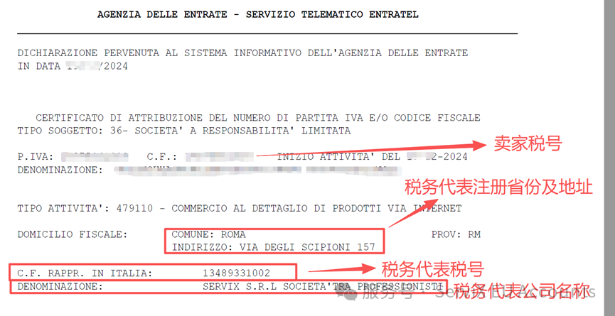 注有C.F. RAPPR. IN ITALIA 处的税号即为您的意大利税务代表的税号。